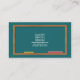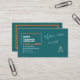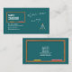 Un carte de visite pour un professeur de mathématiques ou un tuteur en géométrie avec un tableau vert dans un cadre en bois, un compas et des équations de Schrödinger et la loi de Newton de la gravitation universelle. Les icônes sont utilisées pour afficher les informations sur le téléphone et le courrier électronique. Les coordonnées complètes sont disponibles au verso.