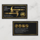 Une couverture entièrement noire avec cadre doré présente un ensemble de marteaux d'or qui s'interceptent. En haut se trouve le nom d'entreprise "HOME HANDYMAN SERVICE" que vous pouvez changer avec votre nom prestigieux dans la direction opposée. Près de la base est le contact téléphonique avec un logo de maison dorée que vous pouvez utiliser. Au-dessus de la feuille, on utilise le même thème de bordure de cadre doré. Les détails de la carte sont sur la gauche avec un logo en or handyman icons que vous pouvez utiliser, en haut. Il est suivi par votre nom prestigieux, les coordonnées et une option de slogan. Une grande carte pour le bricoleur et les entrepreneurs de construction à utiliser.