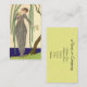 Style Art Déco Illustration de George Barbier d'une Jeune femme portant une Gare de Taffeta Grey debout à côté d'un saule. Le côté information est un arrière - plan jaune pâle vintage avec un texte de style script.