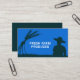 Un carte de visite agricole sur un arrière - plan bleu avec une illustration de la silhouette d'un agriculteur et une feuille de blé. Les coordonnées complètes sont disponibles sur le dos et sont décorées d'icônes.