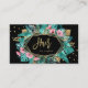 Ces cartes de visite tropicaux à la mode comportent un cadre géométrique d'or de faux avec une série de feuille métallique de regard dans l'or et le vert, et les fleurs tropicales assez roses sur un arrière - plan noir. Le manuscrit manuscrit moderne en or de faux indique des "cheveux", et il y a les icônes sociales de médias d'or de faux sur le dos que vous pouvez personnaliser avec votre username.