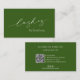 Cartes de visite verts oliviers/forêts modernes avec un design simple et minimal avec "lashes" dans une calligraphie élégante avec votre nom sur le devant. L'arrière contient vos coordonnées, ainsi que des icônes de médias sociaux et un code QR optionnel dans un format minimaliste. Le code QR peut être supprimé et les icônes des médias sociaux peuvent être modifiées ou supprimées dans l'outil de conception.