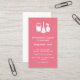 carte de visite vertical à un côté pour un service de nettoyage dans un design rose et blanc. Un seau d'eau savonneuse, un duster et une bouteille de spray. Nettoyez les polices blanches contre un arrière - plan rose.