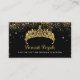 Un riche arrière - plan noir montre une tiare dorée brillante avec des confettis en faux or qui pleuvent du haut de ce carte de visite. Cette carte blanche peut être utilisée par un joaillier, un couturier sur mesure, un technicien en ongles ou toute autre entreprise de beauté. Disponible avec des produits correspondants.