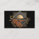 Define your brand with dramatic luxury and cutting-edge design using this captivating business card. The design is centered on a deep, matte black background that provides maximum contrast for the metallic artwork. The focal point is a stylized, multi-layered square and diamond gold frame that showcases an abstract sunset landscape. This scene features layered black and gray hills and a luminous copper or gold sun/moon setting over a reflective, orange body of water. The geometric framework is beautifully softened by stylized copper-toned roses and gold line-art leaves in the foreground, creating a perfect balance between sharp, modern geometry and romantic, detailed florals. This stunning aesthetic ensures a truly memorable and high-end brand statement. This business card is ideally suited for a luxury travel agency promoting exclusive sunset or desert retreats, a fine jewelry artisan specializing in geometric or metallic pieces, or a corporate executive who requires a sophisticated, prestigious contact card. It would also perfectly suit a boutique hotelier specializing in dramatic vistas, or a modern floral designer emphasizing bold, contrasting palettes.