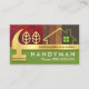 Un marteau doré délimite une scène de paysage supérieure contre une couche de pelouse verte inférieure. Le paysage en haut représente une maison qui est en cours de rénovation avec des panneaux de bois et son jardin magnifié par des arbres d'or. À l'intérieur du marteau d'or se trouve votre prestigieux nom d'entreprise. Vers la base est le titre du travail "HANDYMAN" que vous pouvez changer et le contact téléphonique. Au-dessus, dans une couverture blanche, le logo du marteau d'or que vous pouvez utiliser est en haut. Ceci est suivi par votre nom prestigieux, les coordonnées et une option slogan slogan. Une grande carte créative pour tous à utiliser surtout ceux dans les réparations de maison, handyman, design d'intérieur et les entreprises de construction.