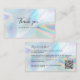 "Un arrière - plan holographique mignon et brillant vous remercie carte de visite pour les propriétaires de petites entreprises et les grandes entreprises. Le design comprend un arrière - plan moderne, script, typographie, polices tendance et simple mais efficace. Parfait pour un esthéticien ou un propriétaire de salon de beauté, un maquilleur, un costumier, un coiffeur, un coiffeur ou un cosmétologue." Ajoutez simplement votre logo, votre nom et vos détails commerciaux à cette carte lumineuse et moderne en cliquant sur le bouton "Personnaliser" ci-dessus. REMARQUE : Les détails holographiques sont simulés dans l'illustration. Il n'y aura aucun effet holographique réel de brillance lors de l'impression.
