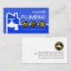 Cover features a white home pipeline design that is leaking dark blue water. Along its pipeline are three gold plumbers icons which can represent some of the services that you offer. Over at the top of the card is your prestigious name and the business name "PLUMBING" which you can change. At the base is a slogan caption option, again change the caption to suit your own service needs.
