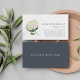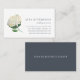 Cartes de visite élégants pour fleuristes, designers floraux, wedding planners ou autres professionnels mariage disposent d'une fleur d'hydrangée blanche accentuée de feuilles d'aquarelle verte douce, avec votre nom et coordonnées alignés sur le côté droit. Cartes inversées à solide bleu fumé avec une ligne de texte personnalisé en blanc immaculé.