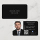 Carte de visite classique sur un arrière - plan noir. Personnalisez et ajoutez Votre nom, texte, photo de profil, coordonnées et votre propre code QR à votre adresse de site Web ou compte de médias sociaux. icône Facebook.