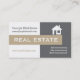 Immobilier gris, blanc, beige carte de visite accrocheur mettant en vedette une petite maison en blanc sur gris, blanc arrière - plan et un groupe beige (kaki, tan) avec le texte Immobilier. Un grand carte de visite professionnel pour le courtier.