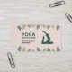 Un carte de visite avec la silhouette d'une femme dans la pose de pigeon roi, feuilles verts et informations personnalisables dans les tons vert et noir. Parfait pour des activités telles que le yoga instructeur ou enseignant, la méditation, centre de relaxation ou de bien-être, thérapeute, etc.