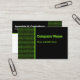 Un design professionnel noir et vert citron qui a un thème cybernétique avec ses détails de code machine. L'avant a vos informations d'affaires dans une combinaison verte/noire à contraste élevé qui ressemble au texte d'un ordinateur sur une console ou un terminal. L'inverse est un classique noir et blanc avec un carré de langage binaire pour ajouter de l'intérêt, et a de l'espace pour vos coordonnées toutes importantes.