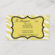 Créez un carte de visite élégant pour une grande impression. Le design graphique en peau de zèbre rayé coloré et en peau de guépard ou de léopard est l'une des tendances artistiques et design les plus chaudes, et est extrêmement populaire de la mode à la décoration maison. Cette collection sophistiquée d'imprimés de zèbre et de guépard jaune et blanc avec du vert citron et du rose fuchsia est conçue pour le style. Un bar vert citron avec une fleur rose fuchsia crée une zone de personnalisation à l'avant. Un emblème jaune sur le dos donne une zone pour ajouter vos coordonnées sur le dos. Il est entièrement personnalisable pour inclure votre nom, vos initiales monographiques, votre nom commercial ou d'autres mots pour vos coordonnées pour votre entreprise ou pour une carte d'appel personnelle.