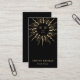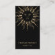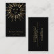 Un carte de visite éthérée céleste avec un mandala solaire doré moderne avec rayons solaires, et les phases de la lune, sur le noir, avec un joli type de signature script moderne. Ajoutez votre titre.