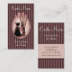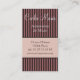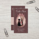 Carte de visite illustrée d'une jeune femme élégante aux côté d'un chat noir. Illustration vignette vintage sur fond rayé rose et gris foncé, réalisée par l'artiste Maryline Cazenave.