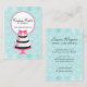 conceptions 2014 de membre de la haute société de ©. Un carte de visite de boulangerie de gâteau de couture avec les remous élégants et le gâteau floral conçoivent, complété avec un ruban rose. L'arrière - plan a un beau motif de damassé et de rayures de turquoise.