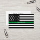 Il s'agit d'un carte de visite professionnel pour les militaires, les gardes forestiers, les agents de conservation et les patrouilles frontalières. L'avant de la carte comporte un drapeau américain avec une fine ligne verte et votre nom sur le dessus en typographie blanche. Le dos de la carte contient du texte noir sur un arrière - plan blanc et contient toutes vos coordonnées, nom, lieu de travail, téléphone, courriel, site Web et adresse.
