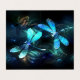 Deux libellules transparentes, lumineuses, turquoise, artistiquement dessinées sur l'arrière - plan de nuit avec des algues luminescentes et des lucioles. libellule éclatante.