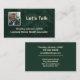 This dark leafy business card template has the text "Let's Talk," your profile photo, and your contact details,. It's great for a mental health counselor, psychologist, psychotherapist, psychiatrist, social worker, or other healing professional. You can easily fill out your text details in the template, or click Customize to make further changes. The front has an abstract dark green photo of green leaves, and the back has a coordinating dark green color, with light gold text and other accents.
