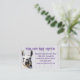 Llama business cards with knit stitches background. Customize purple text in two places with bolder, modern printing at the top for the business name. All other information is in paragraph form next to a fun, black and white llama face. Perfect for a specialty yarn shop, knitting teacher, fiber artist, or llama farmer.