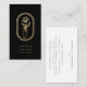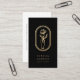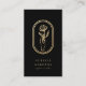 Logo chic bohème à fleurs dorées, cartes de visite professionnels. Cadre en feuille dorée molle avec tige florale et main délicate sur arrière - plan noir. Lignes de texte modèles pour toutes vos informations de contact à l'arrière.