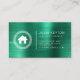 Ce carte de visite immobilier dispose d'un logo maison blanche encadré par un motif de clé grecque circulaire à gauche et d'un simple texte blanc sans serif à droite, avec une ligne verticale entre, sur un arrière - plan en métal brossé vert émeraude. Une version plus grande du logo de la maison apparaît à l'envers.
