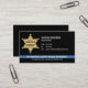 Cette conception comporte un thème de drapeau de la police avec une mince bande bleue. Customisez avec le nom, le poste et les coordonnées de l'agent d'application de la loi, du shérif, du capitaine, du chef ou de tout employé travaillant au service de police.