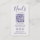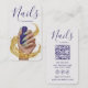 The front design highlights beautifully manicured nails wrapped in shimmering gold details, symbolizing precision, luxury, and expert craftsmanship. The back is clean and functional, offering space for essential contact details, phone number, QR code for easy appointment booking, business address, website, and social media icons—perfect for modern nail technicians and salon owners.