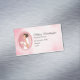 Cartes de visite magnétiques professionnels. Illustration d'une mariée heureuse tenant un bouquet de fleurs dans sa robe mariage blanche et chic et portant un voile simple. Placez-vous à l'intérieur d'un cadre en camol rose avec une bordure en échalotes. L'arrière - plan est une image numérique d'aquarelle rose.