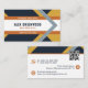Carte de visite élégant avec un design géométrique avec des lignes et des formes flèches en orange, bleu marine, et jaune muet avec gris argenté comme couleur d'accent. Ajoutez vos informations commerciales et un code QR.