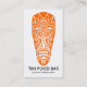 Un carte de visite séduisant avec un motif de style Tiki Masque à la main et audacieux Nom d'entreprise et type d'entreprise sur l'avant avec nom et autres coordonnées sur l'arrière avec trois motifs de masque Tike.