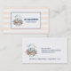 Cartes professionnelles avec un arrière - plan à rayures pêche et un cadre superposé. Conçu avec une illustration créée avec des aquarelles. Un lapin lapin mignon portant une robe bleue assis dans un panier entouré de ses oeufs. Des papillons flottent autour de la corbeille décorée d'un bouquet de fleurs soigné.