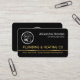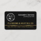 An all black cover is accentuated by a faux gold line near the base of the card. ; Riding on this gold line of success is your business name "PLUMBING & HEATING CO" which you can change. Below this are the contact details. Lettering here are in faux gold. Over at the top is a silver plumbing and heating logo you can use with your prestigious name and job title to the right.
