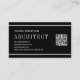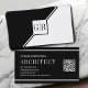 Modern black and white monogram and triangles modern geometric architect business card. The front includes two diagonal stripes one black and one white that separate the card in two triangles. A white square is on the center with your monogram. The back is of black color with two white lines and a QR code for more info.