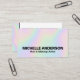 Pastel Rainbow Holographic Business Card. This modern and eye-catching design features a soft pastel rainbow holographic pattern with shades of pink, blue, yellow, green, and purple for a dreamy, professional look.