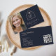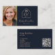 Carte de visite immobilier élégant et professionnel avec une photo à l'arrière. Logo du réacteur moderne sur le côté avant avec police de script en rose vif et arrière - plan dans la couleur bleu marine.