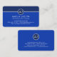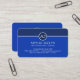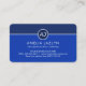 A blue shaded cover is demarcated by a white line near the top of the card. On this line is a white circle logo that has your name initials-monogram inside. Below the logo is your prestigious name, job title and the contact details near the base.