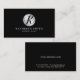 Un design élégant et moderne avec un monogramme de script noir en cercle argenté avec des informations d'affaires en argent style professionnel sur arrière - plan noir.