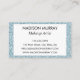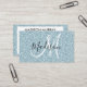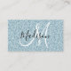 Ce carte de visite chic, girly et glam a une parties scintillant d'argent bleu clair brille arrière - plan de part et d'autre. Sur le devant du carte de visite se trouve votre prénom dans un élégant script noir avec un gros monogramme en blanc derrière. Au verso, vous trouverez votre nom, le titre de votre emploi et les coordonnées d'un arrière - plan blanc. Personnalisez facilement ce carte de visite. Cliquez sur "customiser plus loin" pour modifier la couleur du texte et le style et la taille de la police. Ce carte de visite est parfait pour un maquilleur, coiffeur, consultant en beauté, organisateur d'événements ou propriétaire de salon.