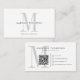 Ce design carte de visite présente un style épuré et minimaliste avec un grand monogramme gris dans l'arrière - plan pour une touche audacieuse mais élégante. L'avant met en évidence le nom et le titre dans une police moderne et propre, tandis que l'arrière comprend un code QR, ainsi que des coordonnées bien arrangées avec des icônes simples.