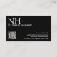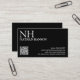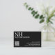 Cartes de visite QR Code moderne avec un design noir simple et minimal avec votre monogramme en caractères gras avec votre nom dans le coin supérieur gauche. Vos coordonnées se trouvent dans le coin inférieur droit.
