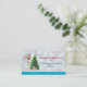 Carte de visite de voeux de vacances avec une drôle d'illustration. Un mignon lama portant des lunettes de soleil noires et un chapeau de santa rouge. Derrière un sapin de Noël avec des cadeaux festifs. Le mot Joy écrit au-dessus de sa tête dans une police de vacances colorée. Arrière - plan de livre d'argent. Design fantasque et amusant à thème de Noël.
