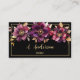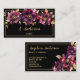 Elégant et luxueux violet doré Carte de visite noir floral. L'avant et l'arrière sont encadrés par un cadre doré et des lettres dorées. Customisez votre nom dans un script doré et optionnel pour modifier le texte et le titre. 3 fleurs et feuilles en violet et or sur un arrière - plan noir et sophistiqué couvrent le dessus de la carte. Le dos a l'essentiel sur le côté gauche comme; nom, titre, slogan ou nom de l'entreprise, adresse, téléphone, web et courrier. Le côté droit haie les fleurs en violet et doré. Un cadre doré le finalise. Ce carte de visite est sophistiqué et luxueux avec de l'or sur le noir avec des fleurs rouges et violettes profondes convenant à un fleuriste, organisateur d'évènements ou commerce différent.