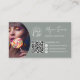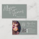 Un carte de visite maquilleur et coiffeur moderne et audacieux, avec un nom surdimensionné à l'avant, avec une police manuscrite et une photo, un code qr et des médias sociaux à l'arrière sur sauge vert. Toutes les couleurs sont modifiables.
