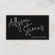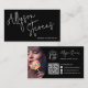 Un carte de visite maquilleur et coiffeur moderne et audacieux, avec un nom surdimensionné à l'avant, avec une police manuscrite et une photo, un code qr et des médias sociaux à l'arrière, en noir. Toutes les couleurs sont modifiables.
