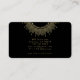 Une carte de visite d'instructrice de yoga céleste éthérée présentant un mandala de soleil doré moderne avec des rayons de soleil et des phases de lune, avec une signature de type script moderne jolie. Effet de feuille d'or faux. Coins arrondis et bordure dorée.