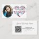 Ce design carte de visite est doté d'un espace réservé photo avec le nom et l'occupation du modèle. Un arbre coloré en forme de coeur partage l'avant. Le verso comprend des champs de texte pour le nom commercial, les détails et le code qr. Remplacez la photo de l'espace réservé par votre photo au format vertical à l'avant et ajoutez votre lien de code QR. Remplissez les champs de personnalisation ou utilisez l'outil Modifier la conception pour sélectionner un style de police, une taille et une couleur que vous souhaitez. La photo de l'espace réservé est gracieusement fournie par pixabay.com.
