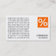 Un modèle de carte de visite avec une image carré attrayante qui peut être changée. Avec un panneau carré de couleur solide pour placer un logo qui a un symbole pourcentage utilisé comme une décoration de logo qui peut aussi être changé. Les coordonnées de l'entreprise sur l'avant avec le nom et les coordonnées sur l'arrière. Peut être adapté à une variété d'entreprises et d'autres usages. Peut également être adapté pour une utilisation plus large comme carte de profil en supprimant ou en échangeant les données de l'entreprise et de son nom personnel. Idéal aussi pour la promotion des albums de CD, si grand pour les groupes et les musiciens.