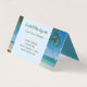 Palmiers tropicaux debout modèle carte de visite. Palmiers et eau bleue de l'océan sont la scène arrière - plan pour le texte vert imprimé sur un panneau bleu pâle. Le dos de la carte est une image de sable et le dessous est bleu mer.